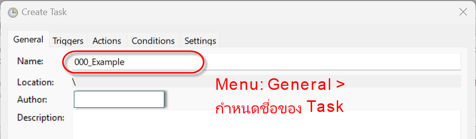 General Tab: ตั้งชื่อและรายละเอียดของ Task