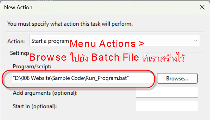 5. ตัวอย่างการตั้งค่า Task เพื่อรัน Batch File